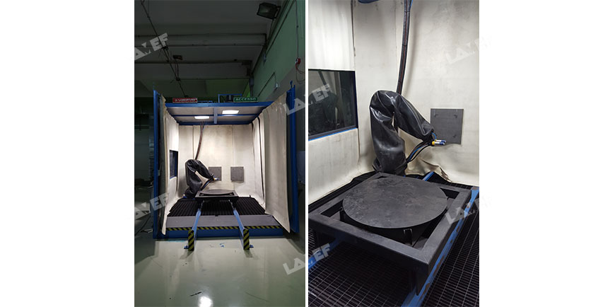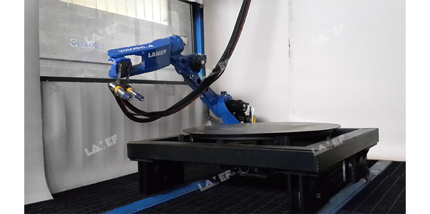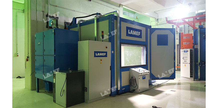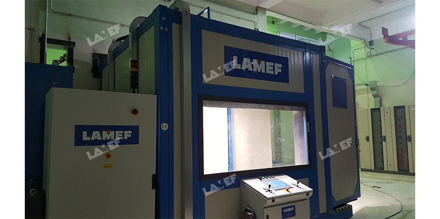 The sandblasting is carried out by means of a special robot moved from the inside of a control room. The operator, by means of a joystick, can adjust the arm to the sandblasting cell at will, to work on the piece to be decontaminated in the most appropriate way.