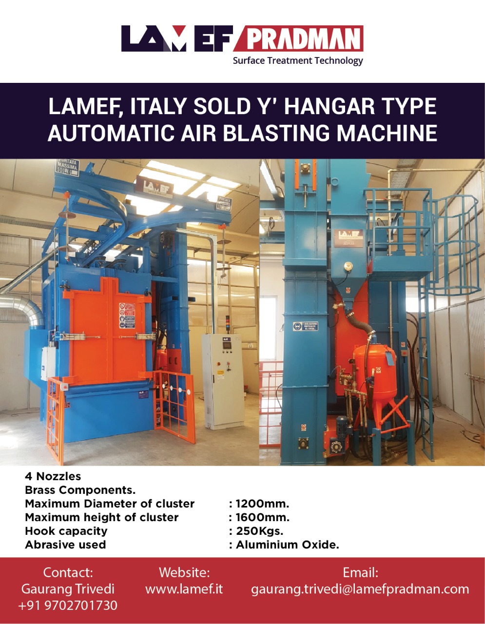 Lamef Pradman Italy supplied Tunnel Blasting Machines with Metal Wire Meshes “SBT 16x10/8MD1 7.5” complete of cartridges filter model “PC 16” 18 June 2019 Lamef Pradman Italy sold Y' Hangar Type Automatic Air Blasting Machine 16 January 2020