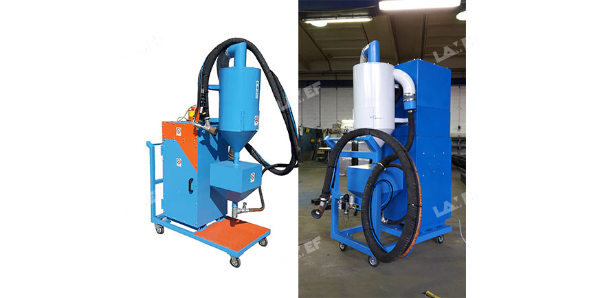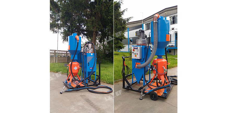 The abrasive is aspirated by means of a high prevalence fan, selected from a cyclone complete with sieve and dedusted by a self-cleaning filter with a cartridge.